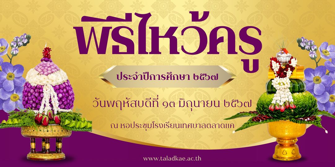 กิจกรรม “ พิธีไหว้ครู “ ประจำปีการศึกษา 2567 กิจกรรม “ พิธีไหว้ครู “ ประจำปีการศึกษา 2567 ในวันพฤหัสบดีที่ 13 มิถุนายน 2567 เวลา 09.00 น. เป็นต้นไป ณ หอประชุมโรงเรียนเทศบาลตลาดแค“ วิชาการเลิศ เด่นคุณธรรม เน้นส่วนร่วมบริหาร ”*** มุ่งมั่น ตั้งใจ เพื่อนักเรียน โรงเรียน และวิชาชีพ ***โรงเรียนเทศบาลตลาดแค ศูนย์พัฒนาเด็กเล็กเทศบาลตำบลตลาดแคกองการศึกษา เทศบาลตำบลตลาดแคกรมส่งเสริมการปกครองท้องถิ่น กระทรวงมหาดไทย