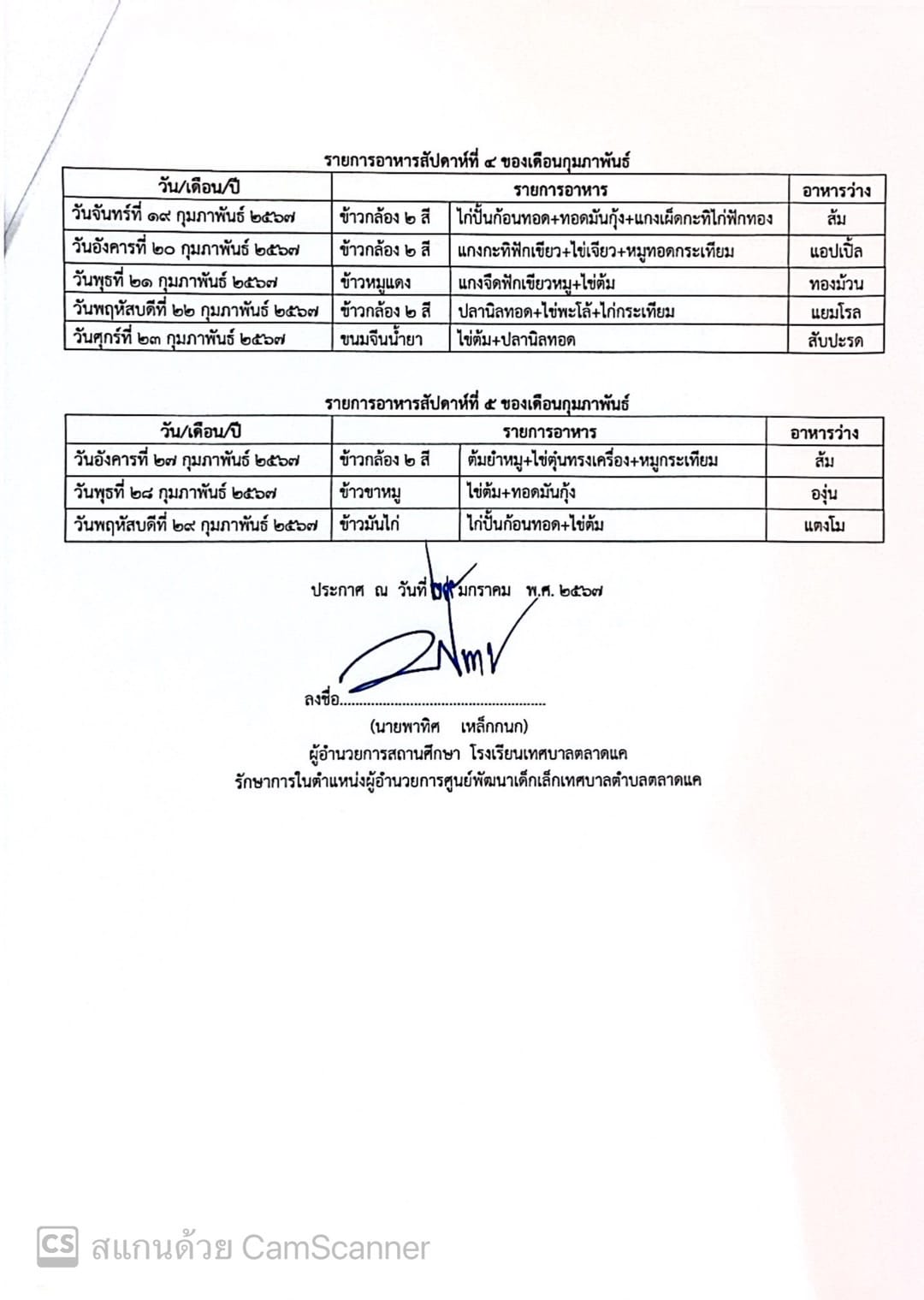 ประกาศโรงเรียนเทศบาลตลาดแคและศูนย์พัฒนาเด็กเล็กเทศบาลตำบลตลาดแค เรื่อง “ รายการอาหารกลางวัน ประจำเดือน กุมภาพันธ์ 2567 “
