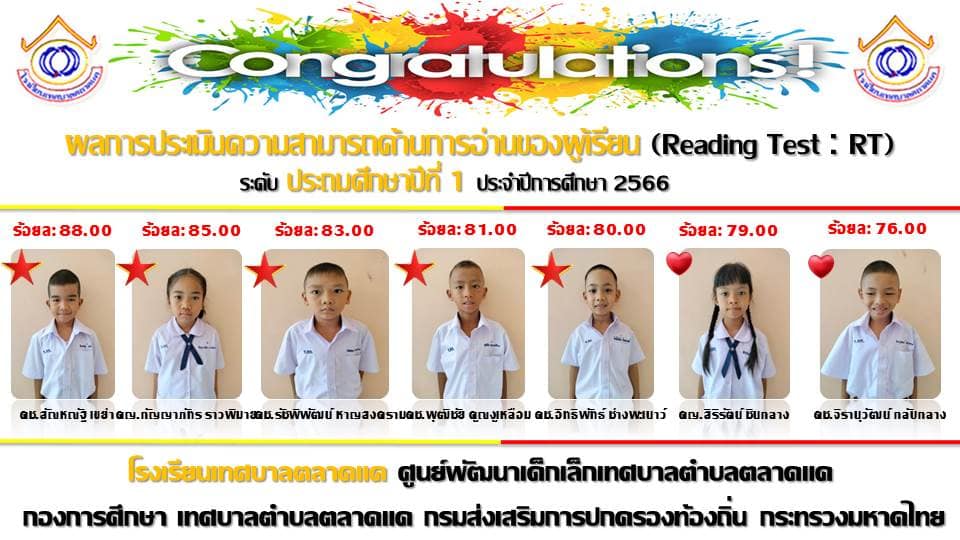 ขอแสดงความยินดีกับนักเรียนคนเก่ง ที่ผลการประเมินความสามารถด้านการอ่านของผู้เรียน (Reading Test : RT) ระดับ ประถมศึกษาปีที่ 1 ประจำปีการศึกษา 2566