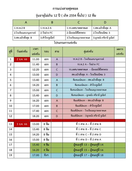 1.รุ่นอายุไม่เกิน 12 ปีชาย ทั่วไป จำนวน 12 ทีม